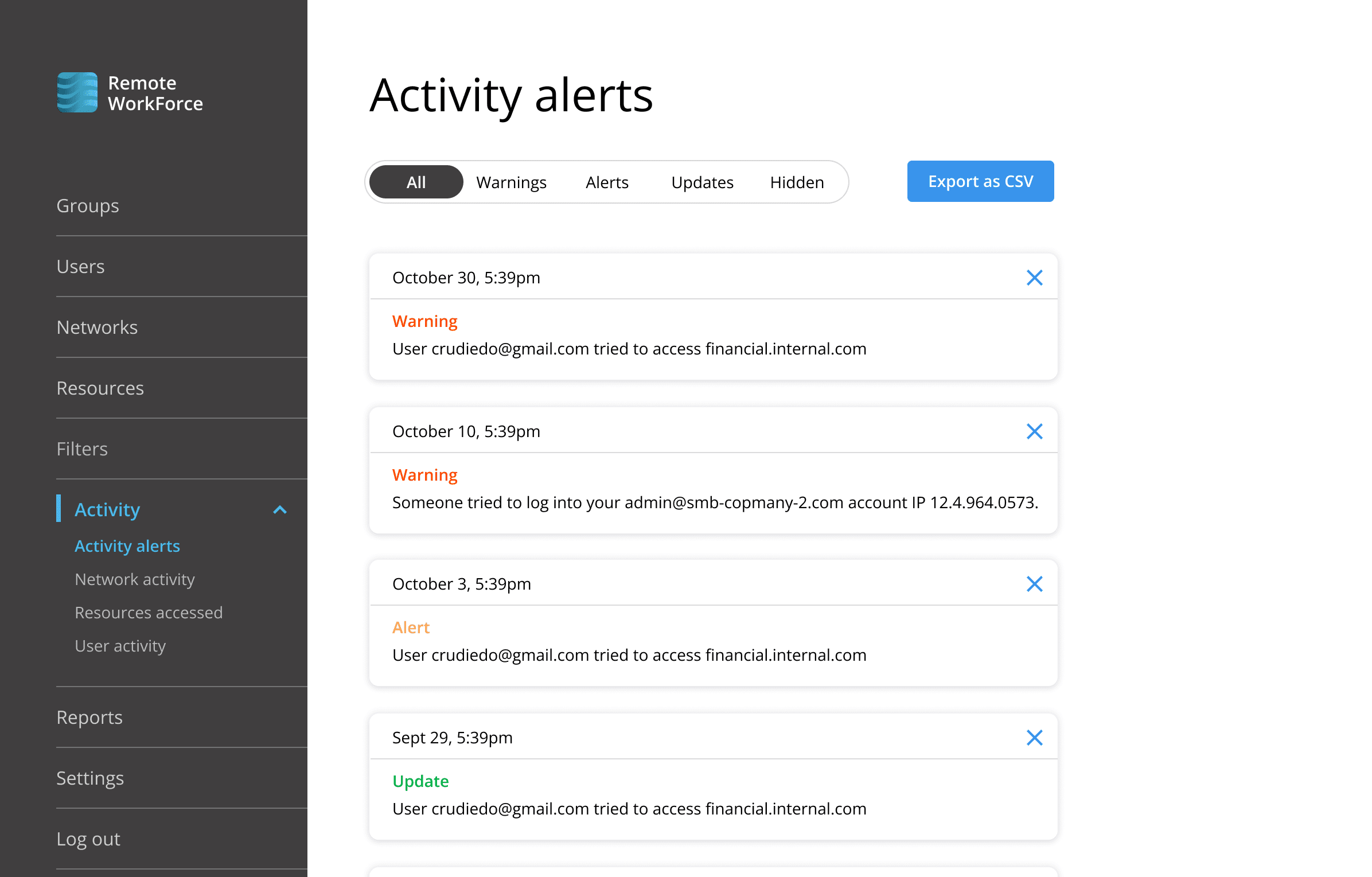 - Extensive reporting of employee on-line activities, resources accessed, network utilization and security alerts.